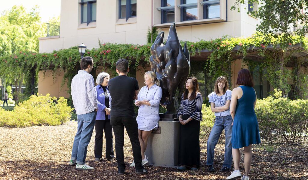“See you at the birds.” Since it was installed in 1966, The Flame Birds has been a focal point, meeting place, and Stanford GSB icon. Antiwar protesters hung signs on it. A prankster in 1977 dressed the sculpture as “The Flaming Wazoo” — a play on its French name, Les Oiseaux Flammes. Several “birds” wearing hula skirts made a starring appearance in the 1988 student show. And on September 11, 2001, students and faculty held vigil around the birds as a place of shared solace.